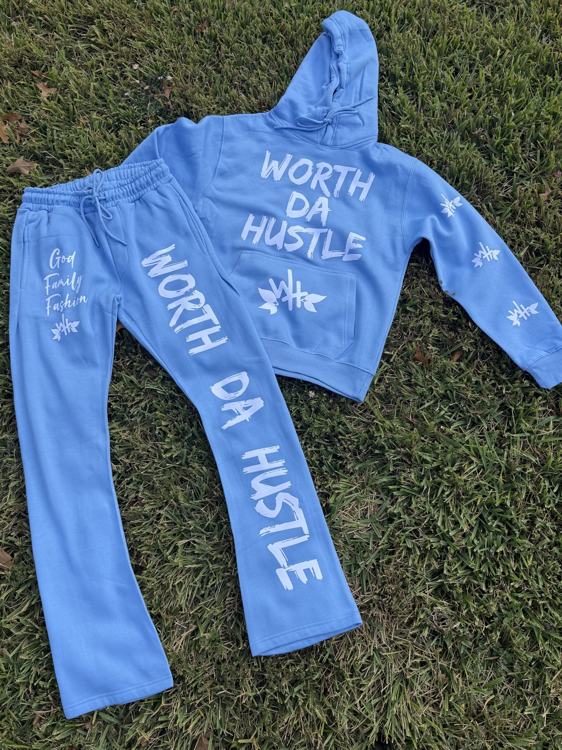 Grab one of our comfortable unisex Sweatsuits that comes with stacked pants  and a Hoodie. Available in 3 colors Pink, Blue, and Purple